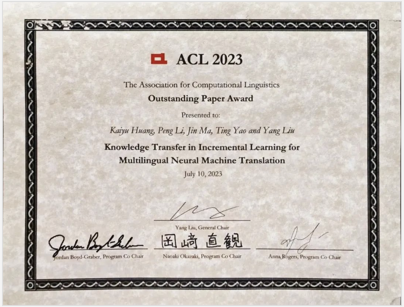 Professor Yang Liu, Excutive Dean of AIR and his research team have made new advancements in incremental learning based on knowledge transfer. Their research paper, titled "Knowledge Transfer in Incremental Learning for Multilingual Neural Machine Translation," was awarded the Outstanding Paper Award at the prestigious international conference ACL 2023, held on July 11, 2023, Beijing time. The paper was a collaborative effort between AIR, the Department of Computer Science at Tsinghua University, the National Research Center for Information Science and Technology at Tsinghua University, the Shanghai AI Laboratory, Tencent, and the University of Science and Technology of China.