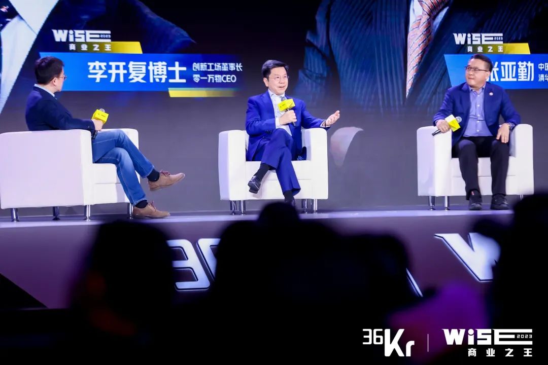 AI大模型带来的机遇到底有多大?“大模型产业机会比移动互联时代多十倍。”今年,有两位身份横跨科学家、企业高管、创业者的AI老兵,给出了同样的判断。36氪本次的开场圆桌,请到了这两位“斜杠”AI老兵——创新工场董事长、零一万物CEO李开复,中国工程院院士、清华大学智能研究院(AIR)院长张亚勤——与36氪CEO冯大刚,进行了一场以《AI的时代重构》为主题的对谈。