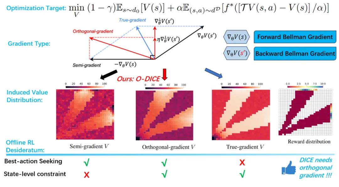 摘要         离线强化学习算法通常需要对策略进行一定程度的约束,这种约束通常控制当前策略产生的数据分布和离线数据分布之间的差异。近年来,许多在动作级别进行策略约束的离线强化学习算法展现出强大的能力。分布校正估计算法(DIstribution Correction Estimation,简称为DICE)作为在状态-动作级别进行约束的一系列方法,具有扎实的理论基础,却在主流数据集上效果不佳,这与状态-动作级别的约束相比于动作级别的约束是一种更加高级的约束相矛盾。本文通过拆解DICE算法中非线性项的梯度并进行修正,从而在避免了反学习(Unlearning)问题的基础上进一步强化了状态级别的约束,使得修正梯度之后的DICE算法能够在多个数据集上也展现出强大的能力。文章中将这种修正之后的DICE算法命名为正交-分布校正估计算法(Orthogonal-DICE,简称为O-DICE)。具体地,本文将DICE算法中非线性项考虑为贝尔曼残差项(Bellman residual term),并首次将DICE算法中贝尔曼残差项的梯度拆解为前向贝尔曼梯度和反向贝尔曼梯度,同时从理论上解释了传统的DICE算法在深度学习框架下表现欠佳的很大一部分原因是反向贝尔曼梯度带来的反学习问题。为了在保留反向贝尔曼梯度信息的同时避免反学习的问题,本文创新性地将反向贝尔曼梯度投影到正向贝尔曼梯度的正交平面内,并将非线性项的梯度修正为正向贝尔曼梯度和投影之后的反向贝尔曼梯度之和(也称正交梯度)。本文从理论上证明了使用正交梯度对DICE的优化目标进行更新可以避免反学习的问题,同时投影之后的反向贝尔曼梯度对于强化状态级别的约束具有重要意义。本文还将正交梯度和状态表征的协同适应问题联系起来,一定程度上揭示了O-DICE能够强化状态级别的约束的原因。最后,本文在离线强化学习和离线模仿学习的场景下均进行了丰富的实验,O-DICE在不同数据集上均展现出十分强大的能力。             本工作已将代码开源于:             //github.com/maoliyuan/ODICE-Pytorch