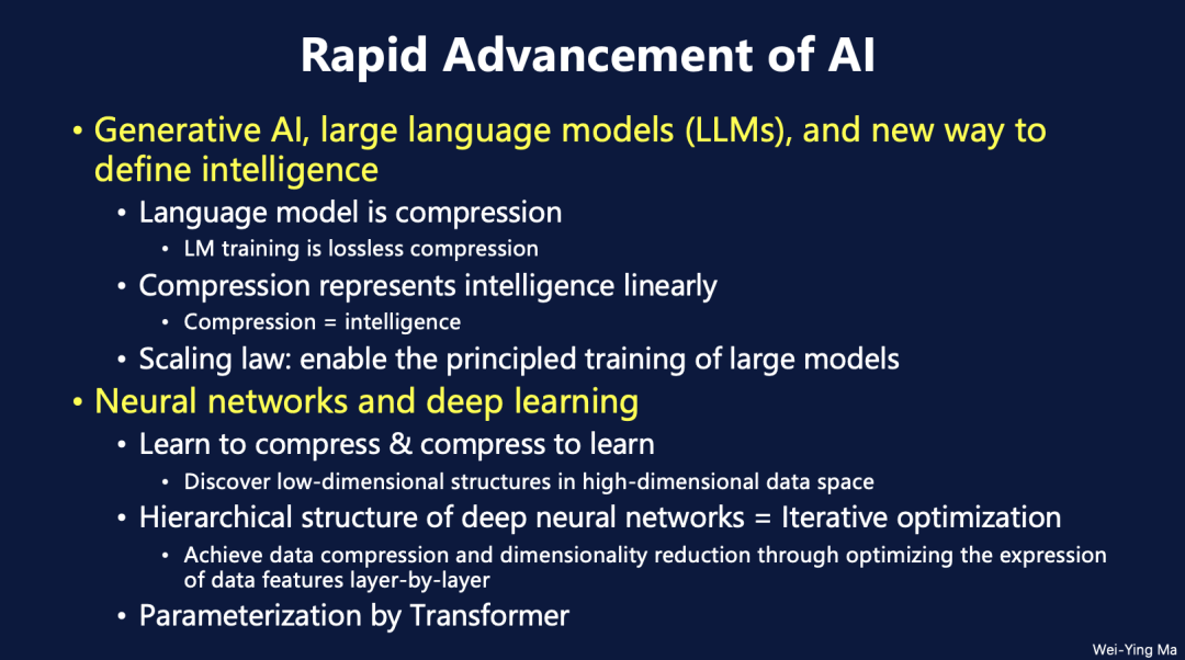 在过去二十年中,语言模型经历了从基础的n-gram模型到复杂模型和压缩算法的演变。马维英教授回顾了这一发展过程,并指出早期模型如n-gram因计算能力和数据存储的限制,难以实现完整的语言建模,从纯自然语言处理(NLP)的角度来看面临极大挑战。后来,物理学家引入了“训练即压缩”的思路,这为NLP领域带来了突破。这一思路旨在将之前所有时刻的信息进行压缩,并根据这些压缩的信息来预测下一个时刻的状态。马教授解释道:“当你早上走进办公室时,如果环境发生了变化,你会立刻感到惊讶,因为你的大脑在预测办公室的可能状态。”最新的研究表明,这种信息压缩与所谓的“智能”之间存在