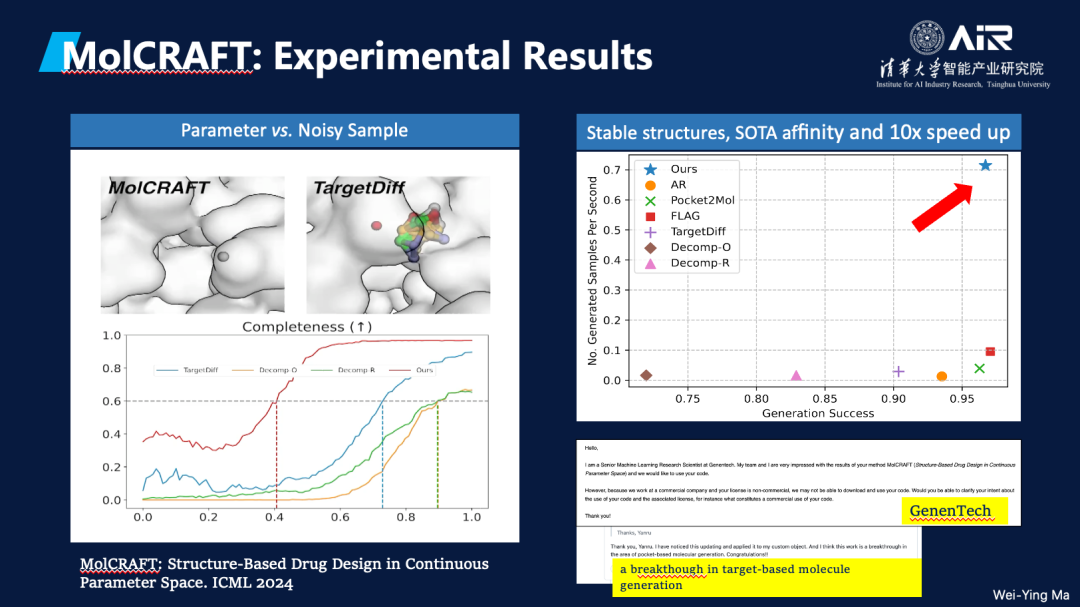 得益于课题组开发的参数空间内的全新采样方法,MolCRAFT 能以数十倍的速度生成结构更稳定、亲和力更强的分子,相较之前基于扩散模型等方法取得显著提升。目前,MolCRAFT 正在被基因泰克(GenenTech)等公司积极使用与探索,有望在未来进一步助推药物设计管线,加速新药发现。