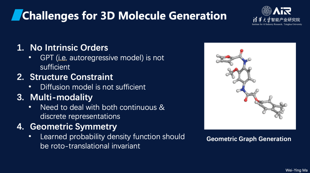 在几何图生成中,存在以下几个 难点:首先, 图中的点没有固定顺序,例如小分子中的原子不具备内在顺序,因此GPT等自回归模型在处理时效率不高。其次, 图结构受到物理限制,这使得diffusion等方法在此场景下可能失效。第三, 多模态问题,例如在生成分子时,既需要生成连续的坐标,又需要生成离散的原子类型,这就需要同时结合连续生成与离散生成方法。最后, 几何对称性的问题,由于分子的平移和旋转理论上不会影响其性质,因此需要设计特殊的网络来满足这一条件。