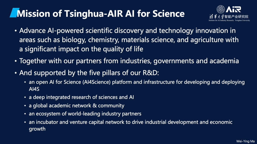 在AI for Science领域的使命是推动生物学、化学、材料科学和农业等领域的AI驱动科学发现与技术创新,并希望能持续提高人类生活水平。AIR致力于与产业、政府和学术界的合作伙伴紧密合作,通过以下五大支柱来实现我们的愿景: