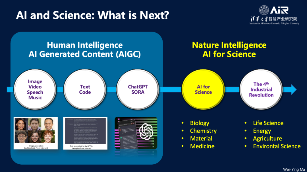 过去几年中,AI展现了强大的AIGC(生成式内容生成)能力,涉及图像、视频、语音、音乐、代码生成和对话等多个领域。展望未来,AI的发展不仅限于这些应用,它将在科学前沿产生重大影响。AI和科学将成为推动社会发展的主要生产力来源,两者的结合将引领AI进入一个新的阶段: 自然智能(Nature Intelligence)。自然界充满了智能,涵盖生物学、化学、材料科学、医学、生命科学、能源和农业等领域。随着这些物质世界的符号逐步实现数字化和智能化,许多复杂的科学问题有望得到解决。AI可能逐渐学会如何组合这些元素,以创造新的物质,如蛋白质、药物、化合物、材料等。
