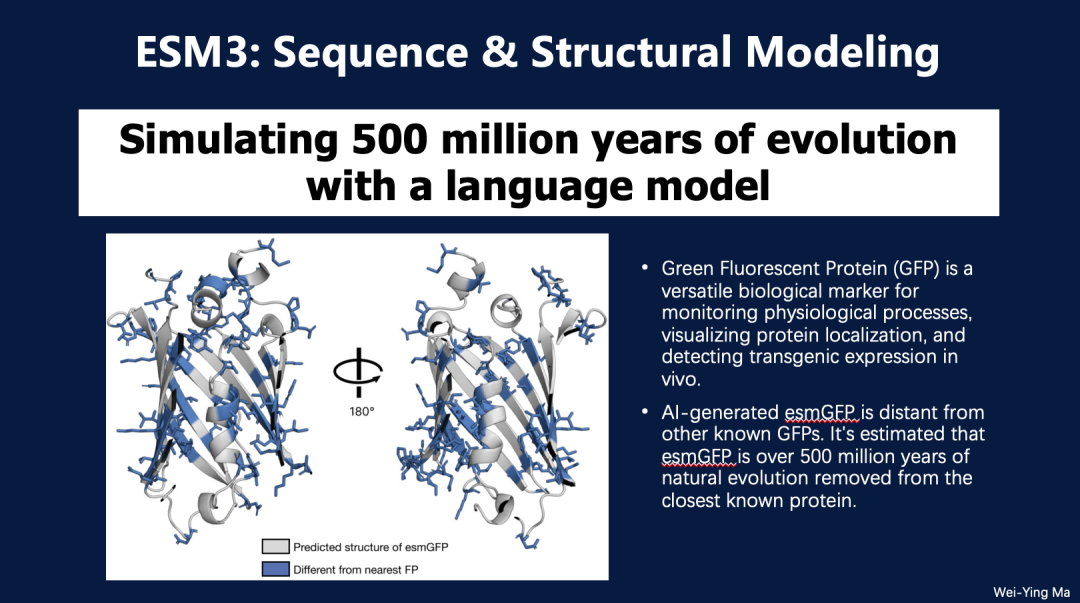 马教授提到ESM3模型,这是首次使用AI成功生成全新的荧光蛋白。 荧光蛋白广泛应用于医学成像,例如用于标记癌细胞,以便进行可视化观察。 通过联合序列与结构建模,该研究生成了与现有蛋白质截然不同的新型蛋白质,打破了传统进化过程可能需要数亿年的时间限制。 此成果展示了AI在蛋白质设计方面的巨大潜力,标志着AI驱动生物分子创新的一个重要里程碑。