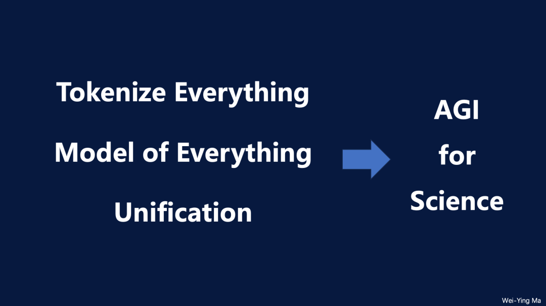 随后,马教授提出了 AI for Science的定义及其发展路径,并从AI研究者的视角进行了阐述。他认为,这一过程可以分为几个关键步骤。首先,需要实现“ 万物的token化”(tokenize everything)。在过去,我们已将虚拟世界中的token化应用于文字、图像等,现在则将这一概念扩展至物质世界,将其进行token化并加以融合。第二步是,一旦实现了这种token化的统一,就能够接近“ 万物模型”(model of everything)的构建。这样的趋势类似于物理学家试图实现的统一场论,今天AI的发展也在走一条通往统一和综合的道路。最终,这种方法有可能推动AGI(通用人工智能)的发展,并使其特别适用于科学领域,即“ AGI for Science”。
