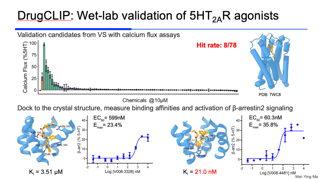 与生物学家和实验室合作,研究课题组对DrugCLIP的筛选结果进行了生物湿实验,并在多个靶点上取得了显著成果。在5HT2AR靶点的测试中,从筛选出的78个小分子中有8个被证实具有活性。未来,DrugCLIP有望显著加速药物发现的进程,为新药研发提供强有力的技术支持。