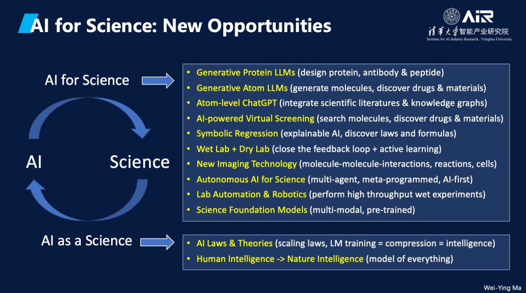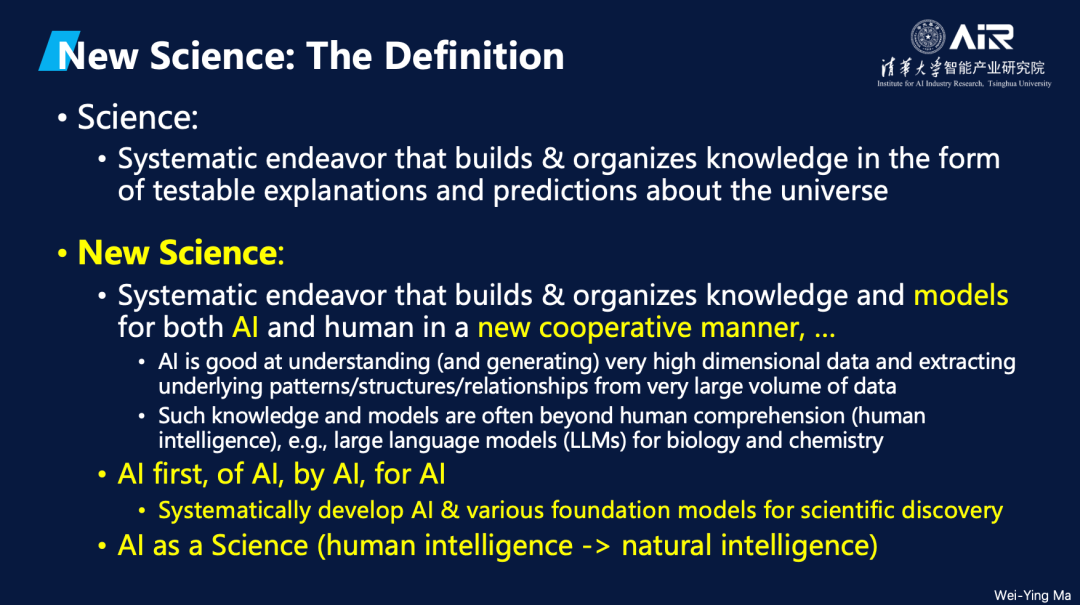 马教授对“旧科学”和“新科学”提出了清晰的定义。他指出,“旧科学”是指系统化地构建和组织人类能够理解和验证的知识体系,并运用这些知识和理论来预测和解释宇宙的运行。而“新科学”是在此基础上引入人工智能(AI in the loop),使AI成为科学研究的一部分。随着科学的发展,知识和数据模型的复杂性已远超人类的理解能力,而 分析海量数据并构建复杂模型正是AI最擅长的事情 。因此,“新科学”强调AI将在科学探索中发挥关键作用,与人类共同构建新的科学知识体系。