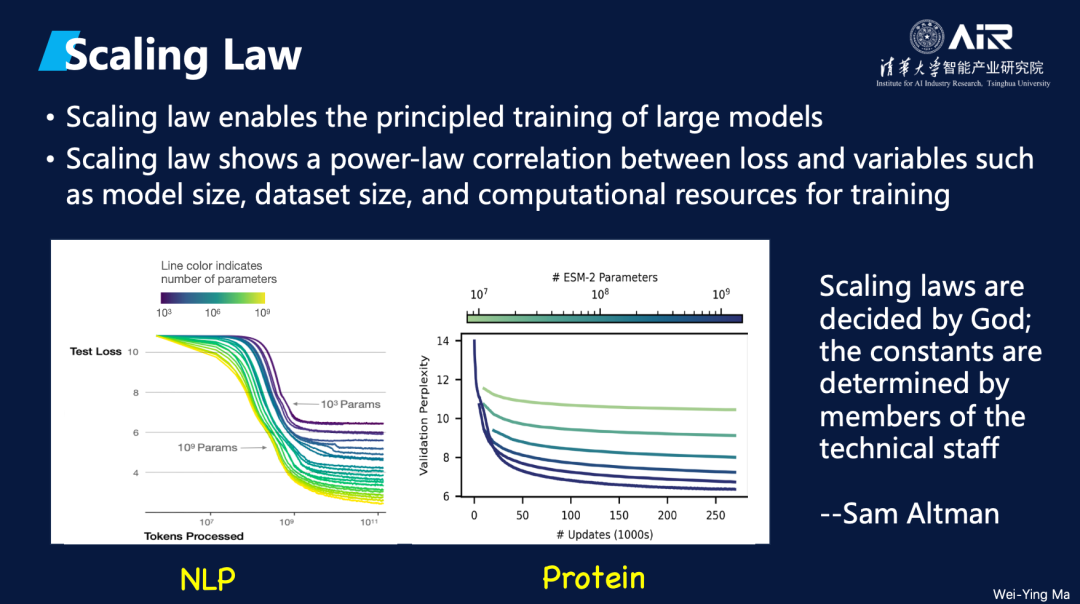马教授引用了Sam Altman的发言:“ Scaling Law is decided by God”,而课题组的技术和工程能力则决定了接近这一规律的速度。马教授进一步指出, scaling law本身在自然界中普遍存在,并且在自然语言和蛋白质等领域中都观察到了类似的现象。