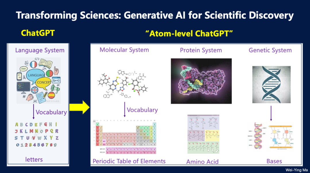 AI在理解人类语言符号系统方面已经取得了显著成功,例如,ChatGPT能够将语言符号组合为具有语义的连贯文本。类似的概念可以扩展到物质世界。所有材料都是由元素周期表中的一百多种元素构成,而蛋白质由21种氨基酸组成的序列构成,并进一步折叠成三维结构。 如果将原子和氨基酸视为“token”,我们可以构建一个“原子级别的ChatGPT”,从而掌握“原子的语言”,实现从原子层面与大自然的“对话”。 这种方法将为理解和设计新物质开辟新的途径,使AI能够探索物质的基本构成,推动科学与技术的跨越式进步。