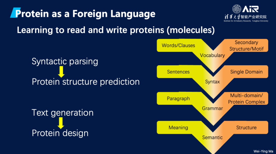 “我们可以把蛋白类比于一种语言,一种外来的语言。起初,我们并不了解如何解读这种语言,也不懂得如何‘书写’蛋白质。”马教授说道,“然而,当我们将其视作人类语言并进行语法结构分析时,这就相当于在进行蛋白质结构预测。而如果我们能够实现文本生成,这就意味着我们可以进行蛋白质设计。”