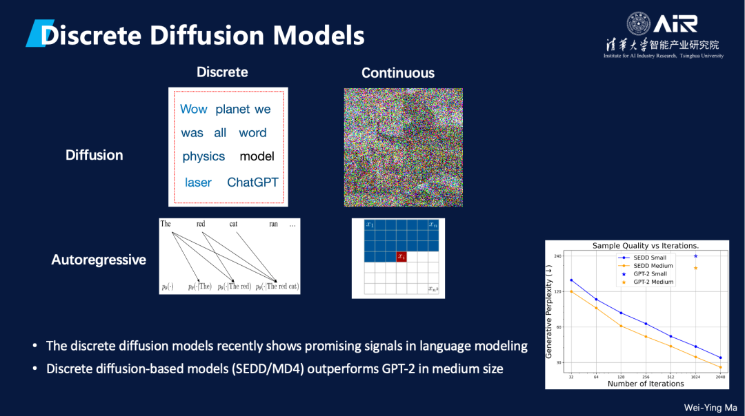 离散扩散模型是当前的前沿研究方向之一,马维英教授认为这一方向具有极大的潜力。目前,尽管离散扩散模型的规模尚属中等,但在文本生成方面已经能够超越GPT-2的表现。马教授指出,虽然扩散模型起初更适用于连续数据,但如果能够开发出高性能的离散扩散模型,将能够获得一些自回归模型不具有的优势,例如在分子生成和符号数据处理中的高效并行生成。离散扩散模型在生成字符或符号时进行并行去噪,从而显著提升分子的生成效率。