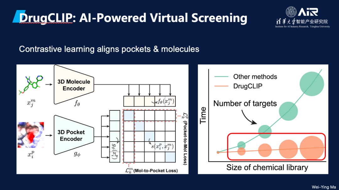 兰艳艳教授 课题组在药物虚拟筛选领域提出了一种新方法——DrugCLIP。虚拟筛选的目标是从化合物库中搜索出能够与特定靶点结合的小分子,这一过程类似于“锁和钥匙”的匹配机制。该课题组采用对比学习方法,将靶点和小分子通过编码器映射到同一向量空间,从而通过稠密检索大幅提升筛选速度。目前,DrugCLIP已实现了每天筛选310T化合物库的速度,为药物开发的高效推进提供了新的技术支持。