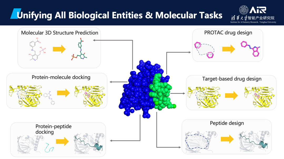 提出了生成式分子基础模型PocketXMol,实现了各种类型生物分子和相关任务的统一。对于结构生物学和药物开发中的大多数任务,如小分子构象预测、多肽对接、基于结构的药物设计和多肽设计等,其本质上都是由原子之间的作用决定的。基于这一原理,课题组提出了一种新的生成式训练框架,对所有分子相互作用任务进行统一学习,并完全使用原子来表征所有类型的分子。