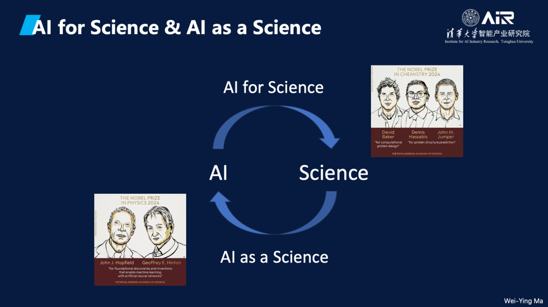 马教授指出,AI与科学的关系可以从两个方面来理解。今年AI领域在两个诺贝尔奖中的体现正好对应这两个方面。第一个方面是“ AI for Science”,即利用AI来解决科学问题。例如,AlphaFold成功解决了长期困扰结构生物学的蛋白质折叠预测问题。第二个方面是“ AI as a Science”,即将AI本身作为一门科学进行研究,这在今年的诺贝尔物理学奖中有所体现。这两个方面共同展示了AI在推动科学进步和作为科学研究对象中的重要地位。