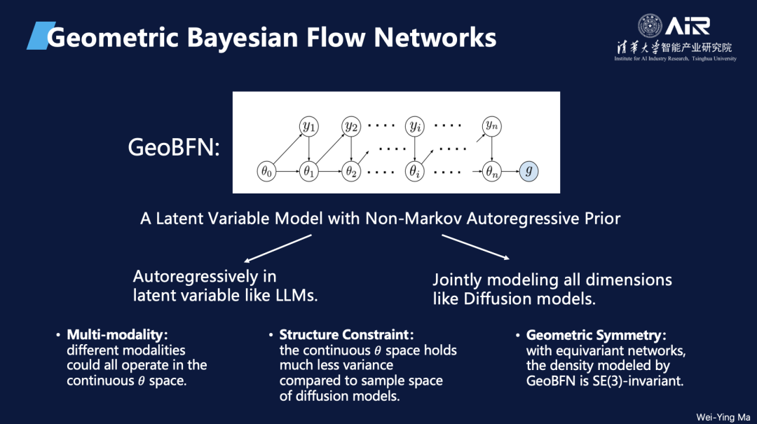 周浩副教授课题组针对以上的分子数据的结构化约束和多模态特征,系统的讨论了扩散模型与几何图数据的不适配性,并且提出了新的分子生成范式 GeoBFN。基于贝叶斯流网络可以多模态并行建模,并且参数空间方差更低的特点,GeoBFN在分子生成的任务上展示了影响深刻的潜力。