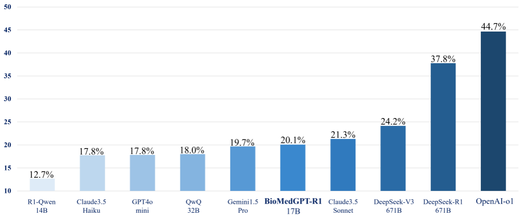 图4:在MedXpertQA专家级医学推理与理解评测集上效果与闭源商用大模型相当