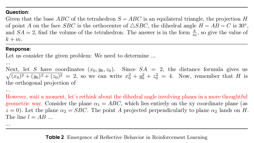 例如,在模型训练的早期阶段,几乎不会出现对先前推理步骤进行检查和反思的情况。然而,随着训练的推进,模型开始展现出明显的反思和回溯行为。这一观察结果为进一步探索和解释强化学习中推理能力的出现提供了思路,后续研究可围绕此展开。