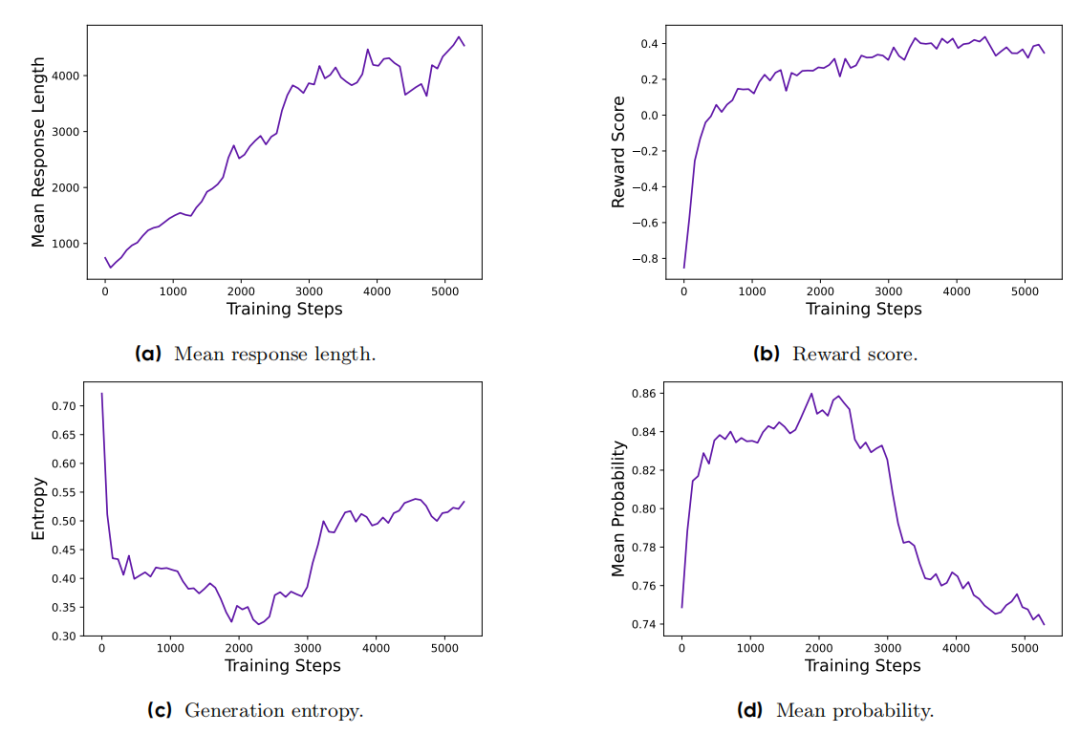 下图展示了 DAPO 的响应长度、奖励分数、生成熵和平均概率的指标曲线,这些曲线体现了强化学习训练的动态变化,是识别潜在问题的重要监测指标。
