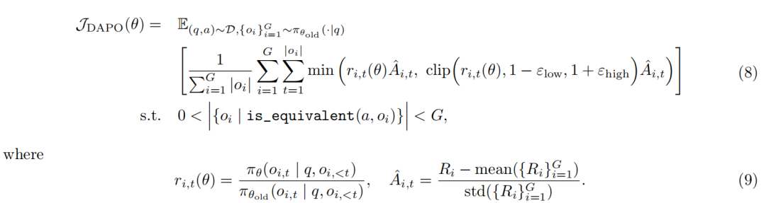 研究团队通过引入四项关键技术(Clip-Higher、Dynamic Sampling、Token-Level Policy Gradient Loss、Overlong Reward Shaping)提出了 DAPO 算法。DAPO 的目标函数如下: