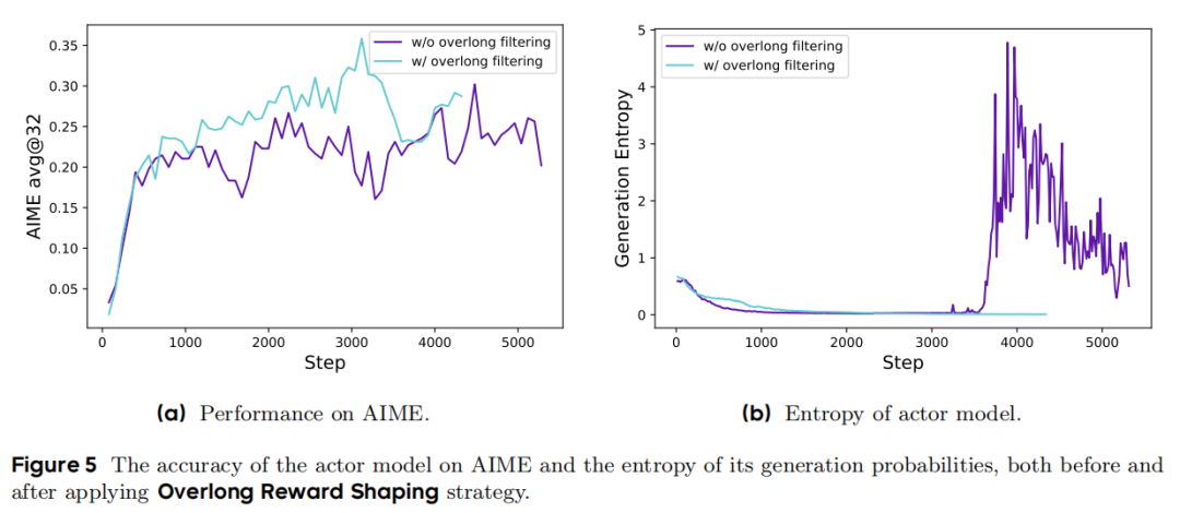 为探究奖励噪声的影响,先采用了过滤超长样本(Overlong Filtering)策略,屏蔽截断样本的损失。结果表明,该方法显著稳定了训练并提升了性能。