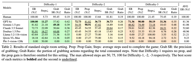 评测结果显示:GPT-4o 在 Difficulty-3 中仅有 26.5% 的子目标达成是“真正理解后完成的”,其余大多为偶然成功(比如想拿电视却误抓到关键道具)。