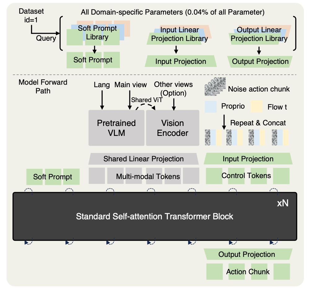 面向本体泛化的Soft-Prompt机制:为克服不同机器人平台在自由度、相机观测视角等本体参数上的差异,本研究引入了可学习的Soft-Prompt。该机制动态地将具身本体的硬件配置信息编码为一种连续表征,使模型在预训练中能够解耦任务策略与具体执行器,从而显著增强模型对异构机器人平台的适应能力,并提升混合数据训练的稳定性与效率。
