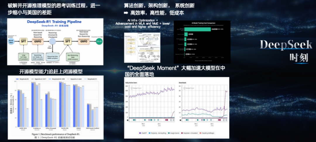 DeepSeek出现之前,我曾经说过,我们和美国在大模型领域的差距,大概是两到三年。DeepSeek是一家小小的创业公司,它的工程团队离清华可能就 5-10 分钟的路程,团队里很多都是清华的学生。DeepSeek所做的,是一条新的路径,在算法、技术、系统架构上都有创新,它用1%的算力就可以达到和美国前沿大模型相似的能力。DeepSeek出来之后,咱们和美国的差距可能就缩短到2-3个月,也就是一个版本的差距,从之前的2-3年缩短到 2-3个月,而且在有些应用方面,我们可能做得更好。另外它采用开源模式,它的开源模型很快就被很多买不起大模型的国家、地区所使用,这使得整个模型的落地和应用变得越来越快。所以我把它叫做“DeepSeek时刻”,一开始有“ChatGPT时刻”,现在这是“DeepSeek时刻”,是属于中国的时刻。