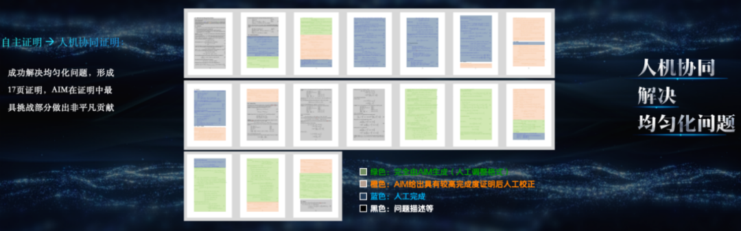 AIR李鹏老师团队与清华大学丘成桐先生的数学研究院合作,研发了数学智能体AIM。它能够分解任务,完成定理证明。例如在材料科学、分子动力学领域的重要难题“均匀化问题”的证明中,AIM形成了17页的证明文档,其中绿色部分完全由机器生成,橙色部分主要由机器证明后经人工校正,蓝色部分为人工完成,黑色部分是问题描述。这是人机协作的绝佳范例,据数学老师反馈,证明中最难的部分由AI完成。