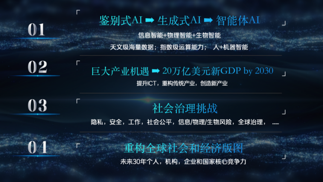 当前,人工智能正从鉴别式AI走向生成式AI,并逐步迈向智能体AI。新一轮人工智能是信息智能、物理智能和生物智能的融合,是原子、比特和分子的融合,是碳基生命和硅基世界的融合。在这一进程中,我们拥有天文级海量数据、指数级运算能力,更重要的是人与机器将协同进化,催生巨大的产业机遇——达沃斯AI理事会预测,到 2030 年,人工智能带来的新机遇将创造20万亿美元的经济价值,超过当前许多国家的GDP总量。同时,我们也面临着隐私保护、安全保障、就业转型、社会公平、风险治理等一系列社会挑战,人工智能将重构全球社会、经济版图。