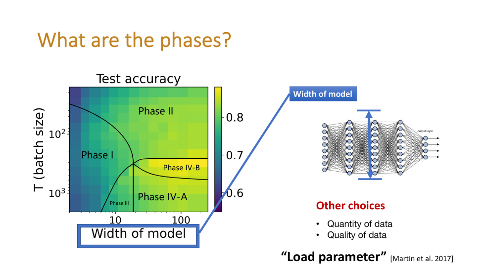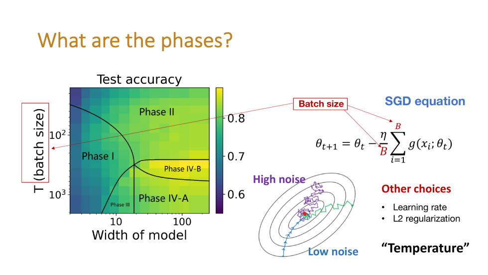 杨耀青博士及其团队在 NeurIPS2021 的一篇工作“Taxonomizing local versus global structure in neural network loss landscapes”中指出,损失函数形态与模型泛化性之间呈现的关系与模型训练超参所处的 ”相” (Phase)有关,而“相”对应的模型性能则可以通过 ”相图” 来刻画。相图的横轴对应于模型的 ”尺寸”,可以是隐藏层的大小、训练数据的数量或质量等;而纵轴则对应于训练的”温度”,表示模型在训练过程中的噪声程度,可以是 batch 的大小、学习率等。而图中的色温则代表模型的性能,如准确率。这种关于相图的研究在机器学习的统计物理方法(statistical mechanics of machine learning)中有着广泛应用。