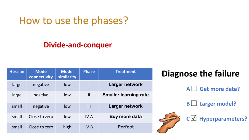 相图可以用于解释许多机器学习中与泛化有关的现象。首先,关于报告开头提到的损失函数局部形态与泛化性的关系,通过相图可以发现,模型”尺寸”较小时,泛化性最好的位置并不是局部最为平坦的位置;而模型尺寸较大时,则会在局部平坦的位置取得较好的泛化性。更重要的是,相图可以直观地查找模型训练过程中的问题,用来得到比较合适的调参方向(比如,增大数据集,或者改变模型,还是进一步调整参数大小)。