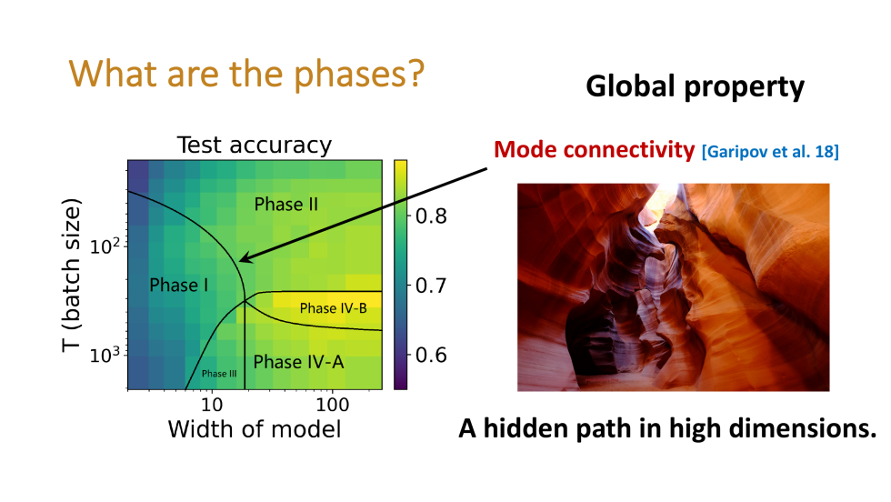 “相“可以由两种依据进行划分。(一)极小值的局部形态(local landscape),也就是在收敛点附则极小值随扰动的变化率,可以使用损失函数 Hessian 矩阵的特征值进行定量刻画。特征值高或者Hessian的迹(Trace)大则表示变化较为剧烈。(二)极小值之间的全局特征,可以使用模式之间的连通性(mode connectivity)来衡量。直观来说,也就是收敛点到其附近的其他极小值的路径上是否会存在较大的 loss。由此,我们可以从损失函数的局部和全局形态两个角度,将训练的超参数划分为 4 个相。而对于较为理想的 Phase-IV,其又可以进一步按照模型之间的距离远近分为 IV-A 和 IV-B。研究发现,收敛点附近损失函数平坦,模型连通性良好且距离较近的相位(IV-B),容易表现出更加优良的泛化性。